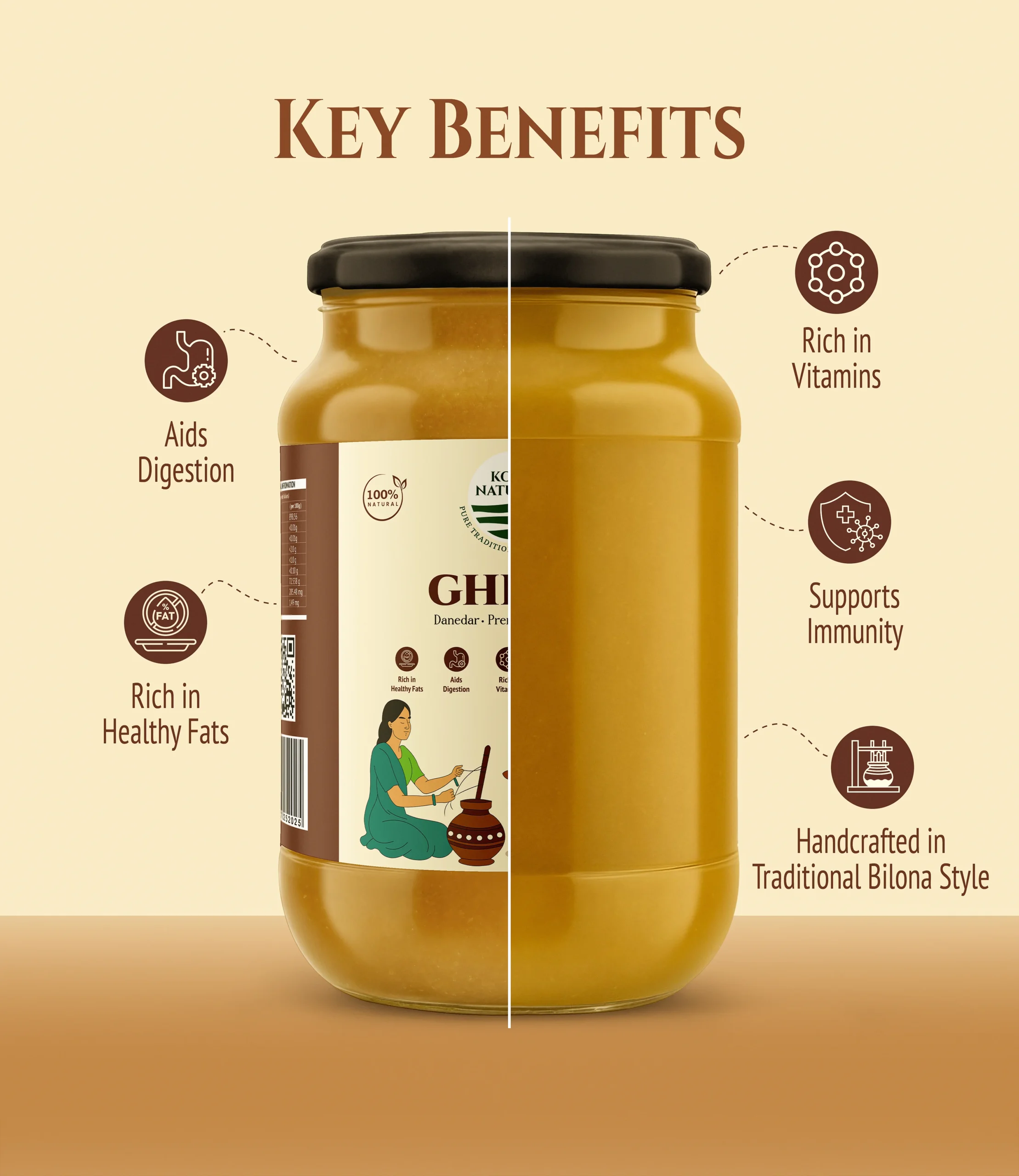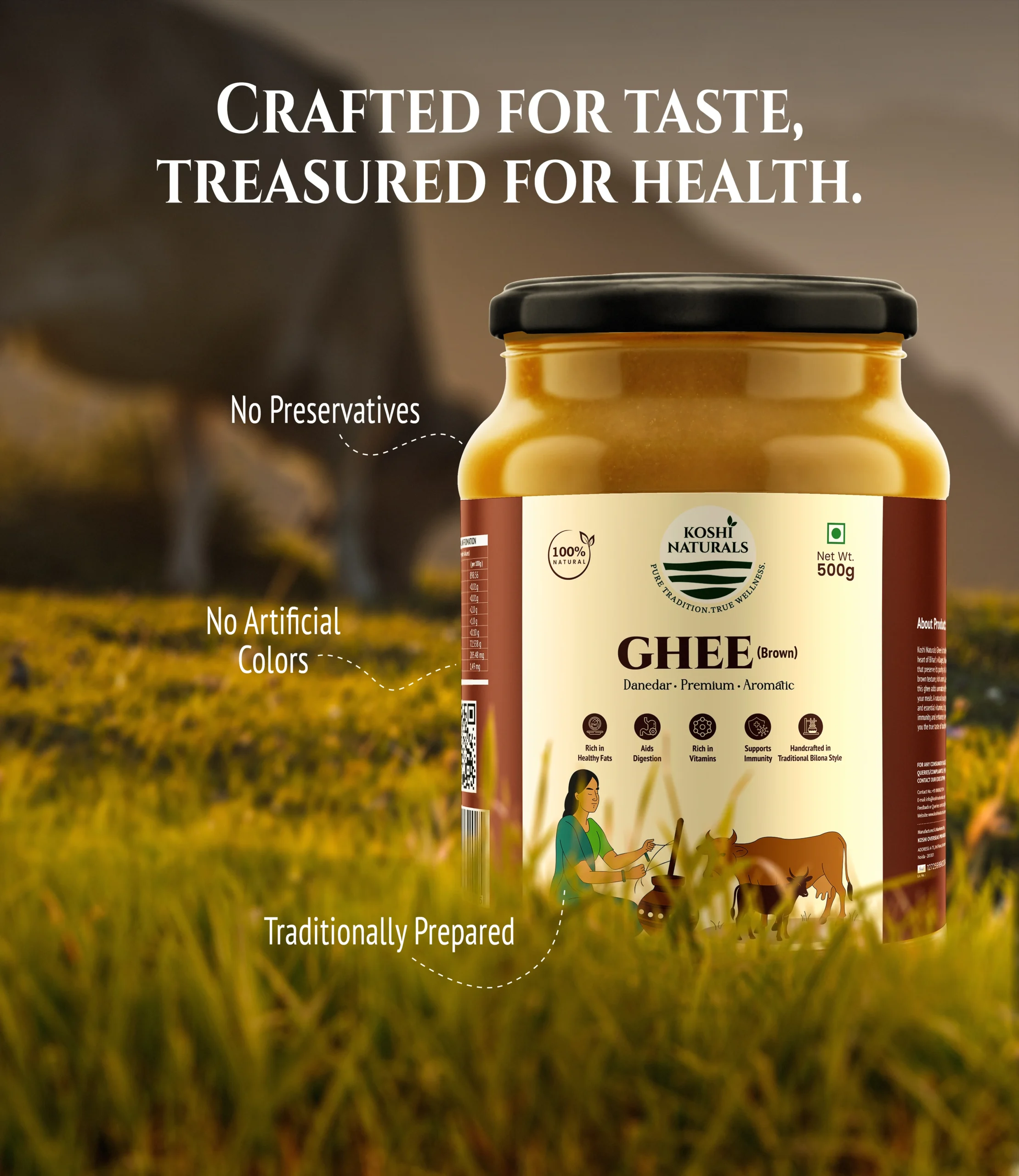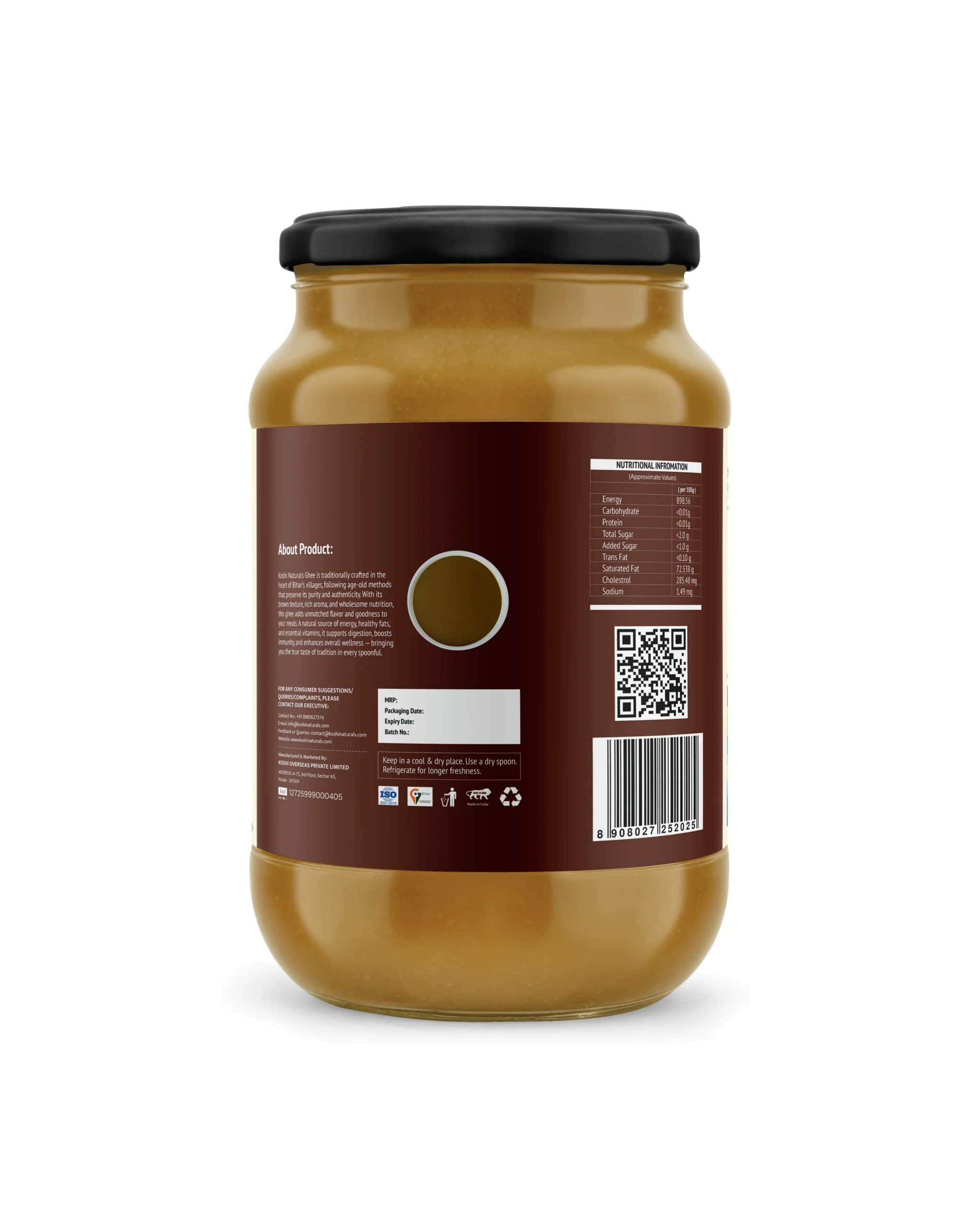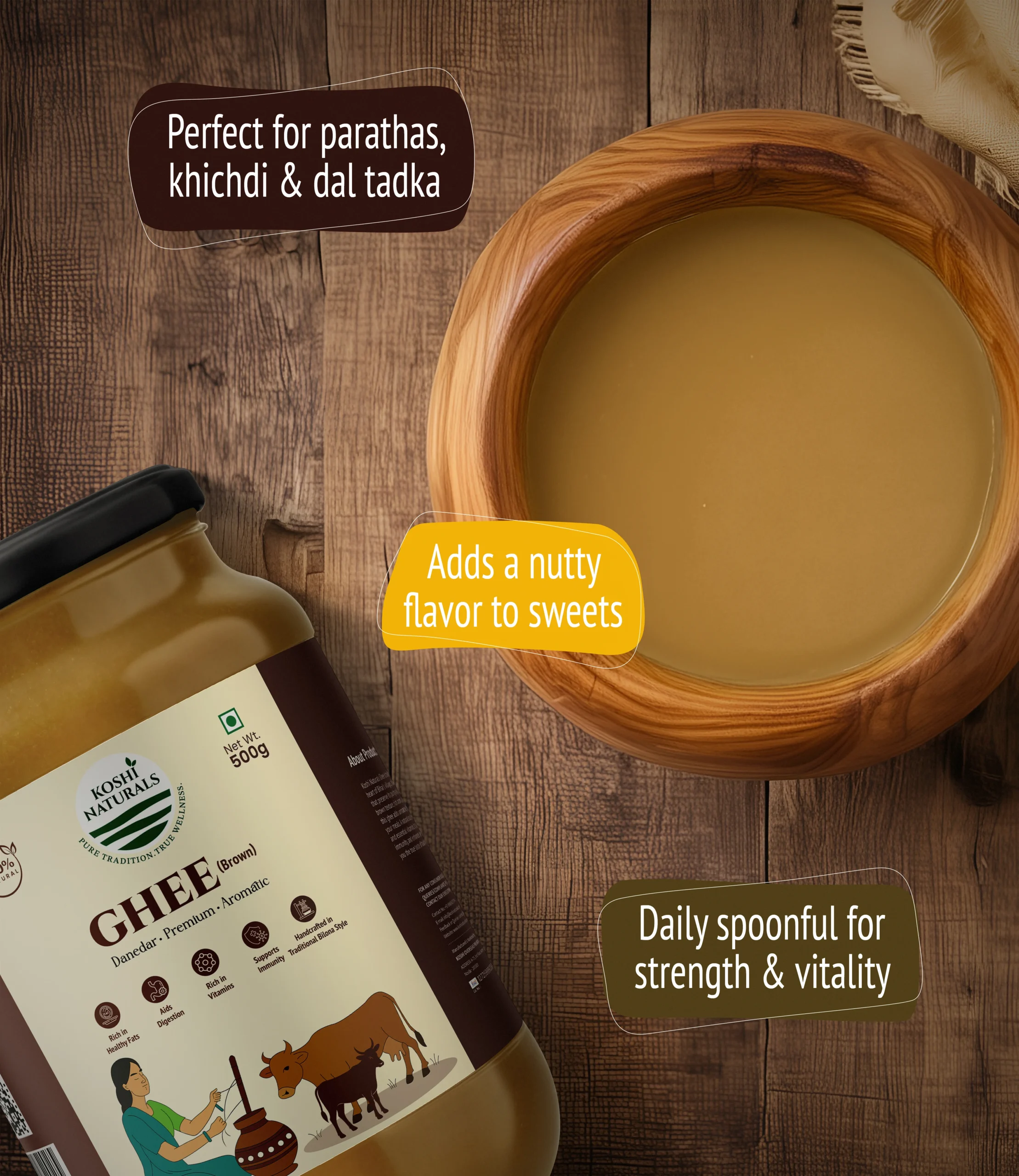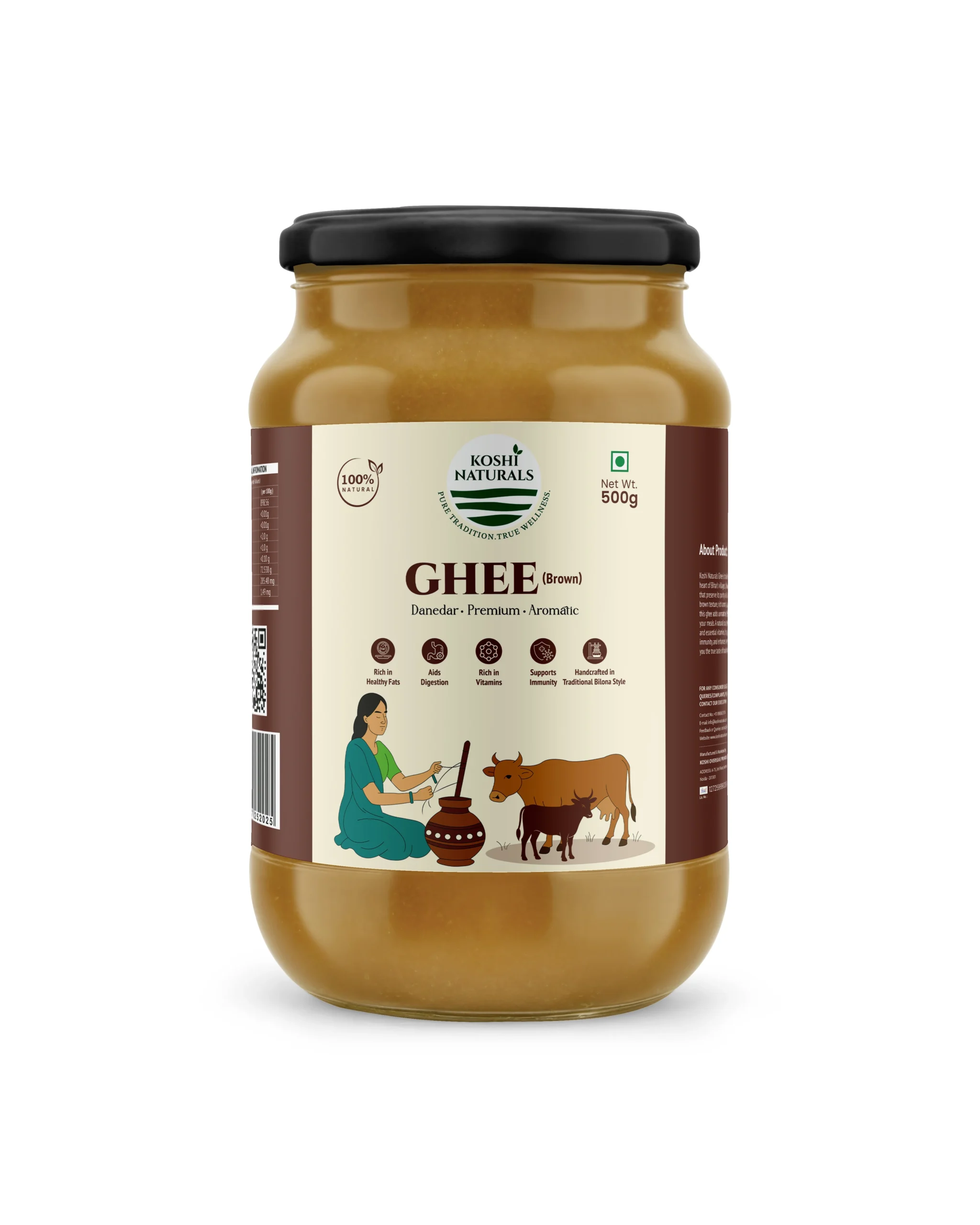 Koshi Naturals Brown Desi Ghee is prepared from cultured curd, giving it a deep golden-brown tint and a nutty, earthy flavor. Rich in vitamins and probiotics, this ghee is highly nutritious and considered superior in Ayurveda for strength and vitality.
