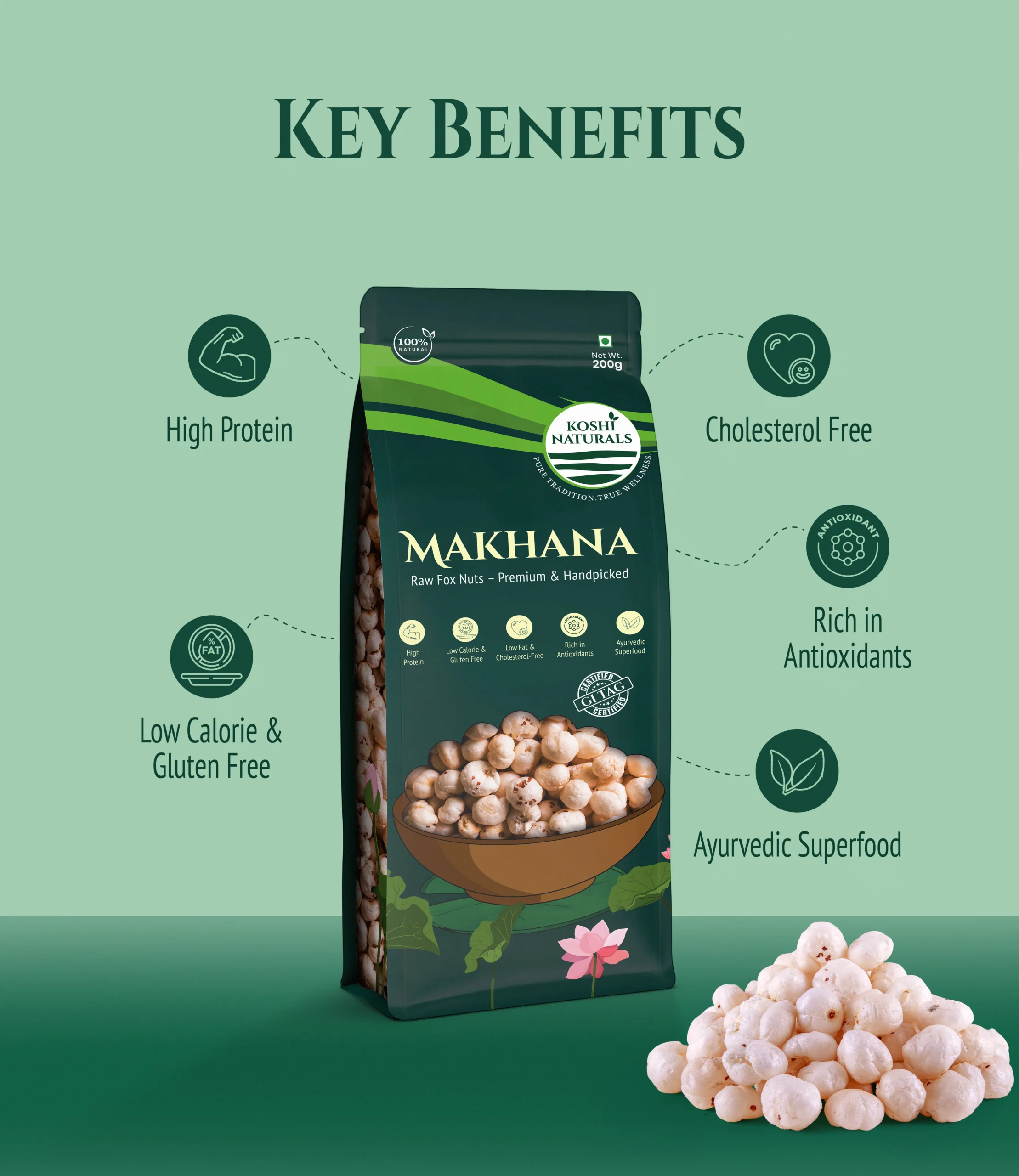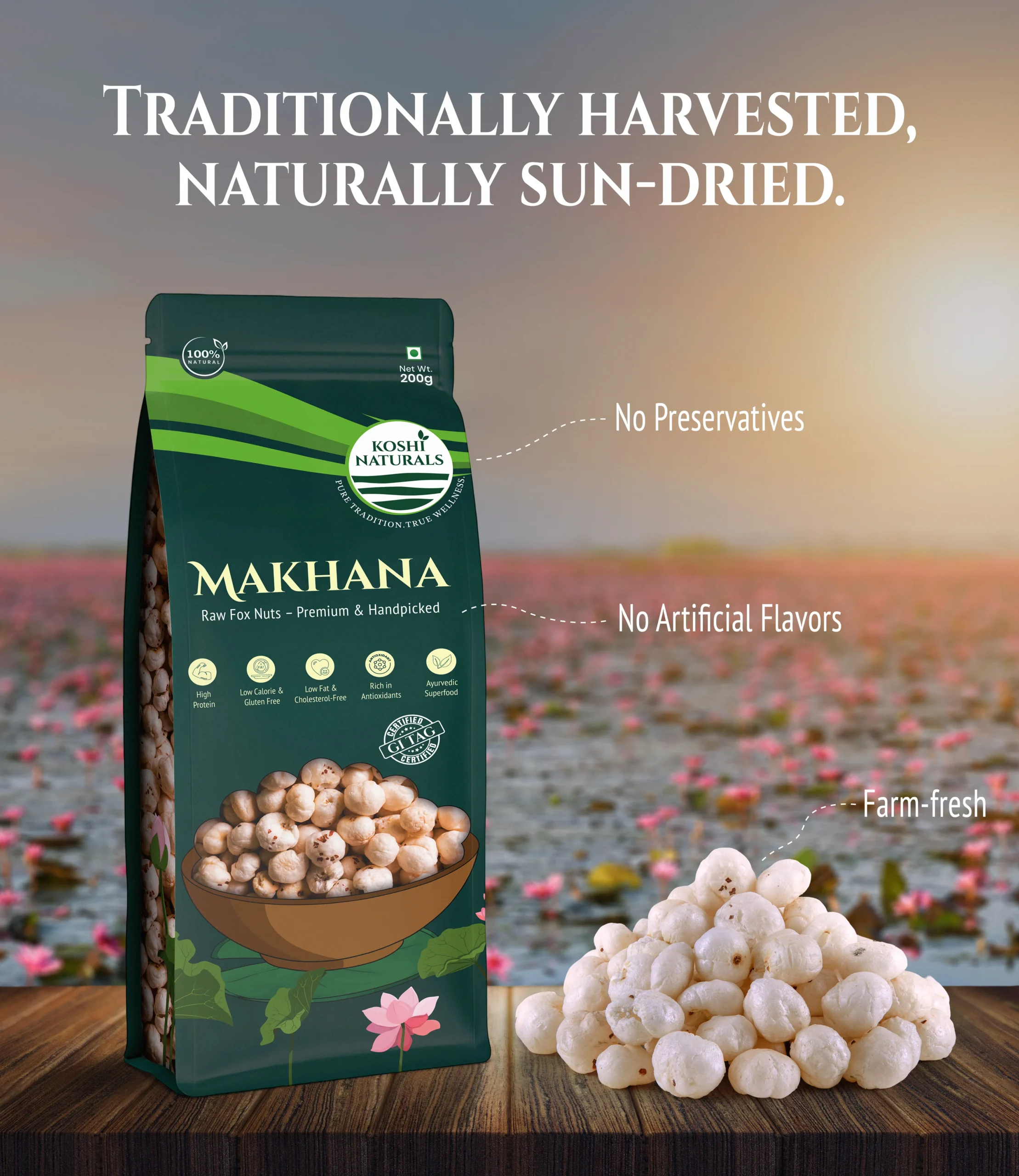 Crispy, light, and nutrient-rich, Koshi Naturals Makhana is sourced from the clean waters of Bihar. Rich in protein, calcium, and antioxidants, it makes for a guilt-free snack and a healthy alternative to fried foods.
